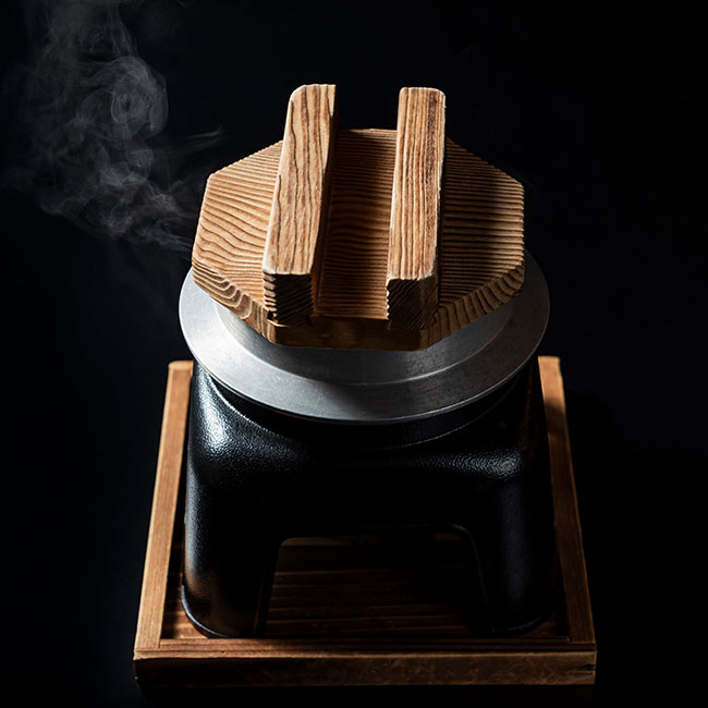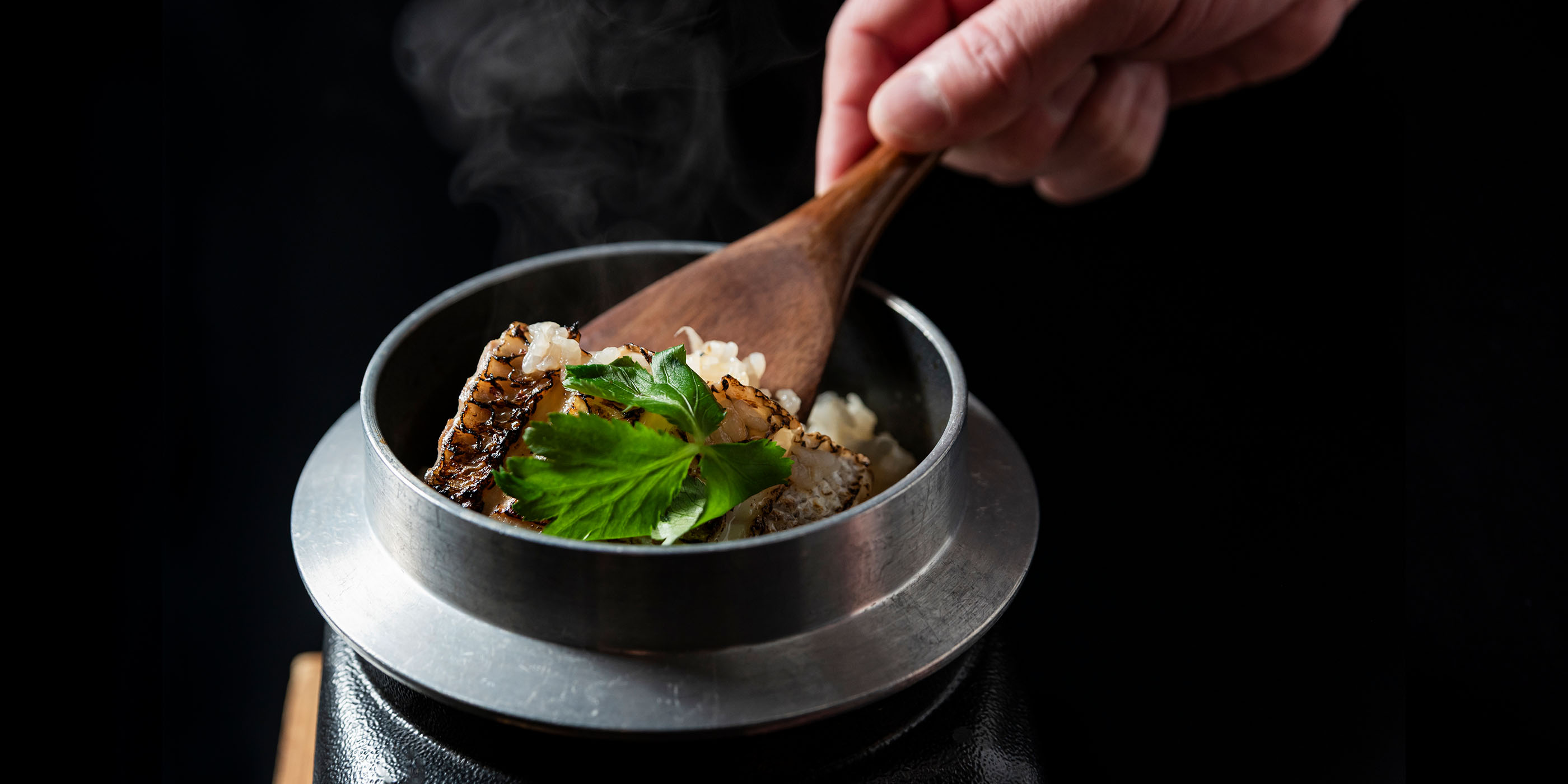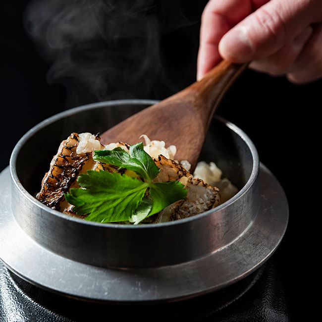 当館では、ひと塩あてて焼いた鯛の身を釜でふっくら上品な味に炊き上げた「伊予の鯛めし」を